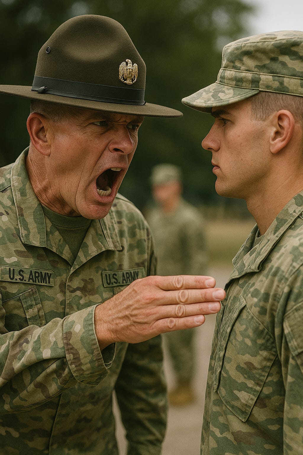 Above is a picture of a drill sergeant introducing a young trainee to this gesture. This knife-hand is not limited to one branch of service but the use of this gesture extends across all branches of service. Loud verbal communication usually accompanies this gesture which helps to make it that much more effective, but it is not always necessary because once a trainee becomes accustomed to this gesture, they know that it means they are about to face some corrective action of some sort. The knife hand is not only used for discipline. It can be used during a briefing to help emphasize a point, give directions when seeking cover during a firefight, or give direction down range as to where to focus the firepower of the most powerful fighting machine in the world. There is no more iconic gesture or form of non-verbal communication than the knife-hand. So why is the knife hand more effective than simply using a single finger or even two? One single finger is still just as easy to see and even can be intimidating when placed right next to your nostrils, but what better way to give more emphasis than having all five digits of your hand pointing at the problem you are trying to correct or the direction you are supposed to go. It is much harder to see one finger pointing